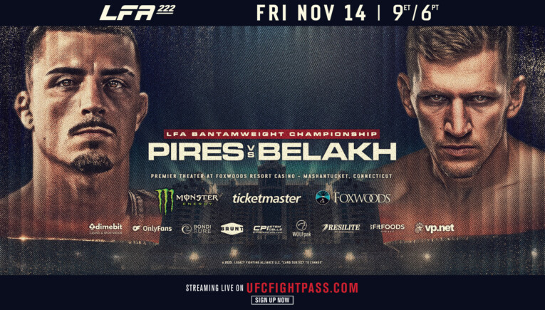 MASHANTUCKET, CONNECTICUT (November 12, 2025) - Legacy Fighting Alliance returns to Foxwoods Resort Casino in Mashantucket, Connecticut for its 222nd edition. LFA 222: Pires vs. Belakh, presented by Monster Energy, will be available worldwide on UFC FIGHT PASS® at 9 p.m. ET / 6 p.m. PT.