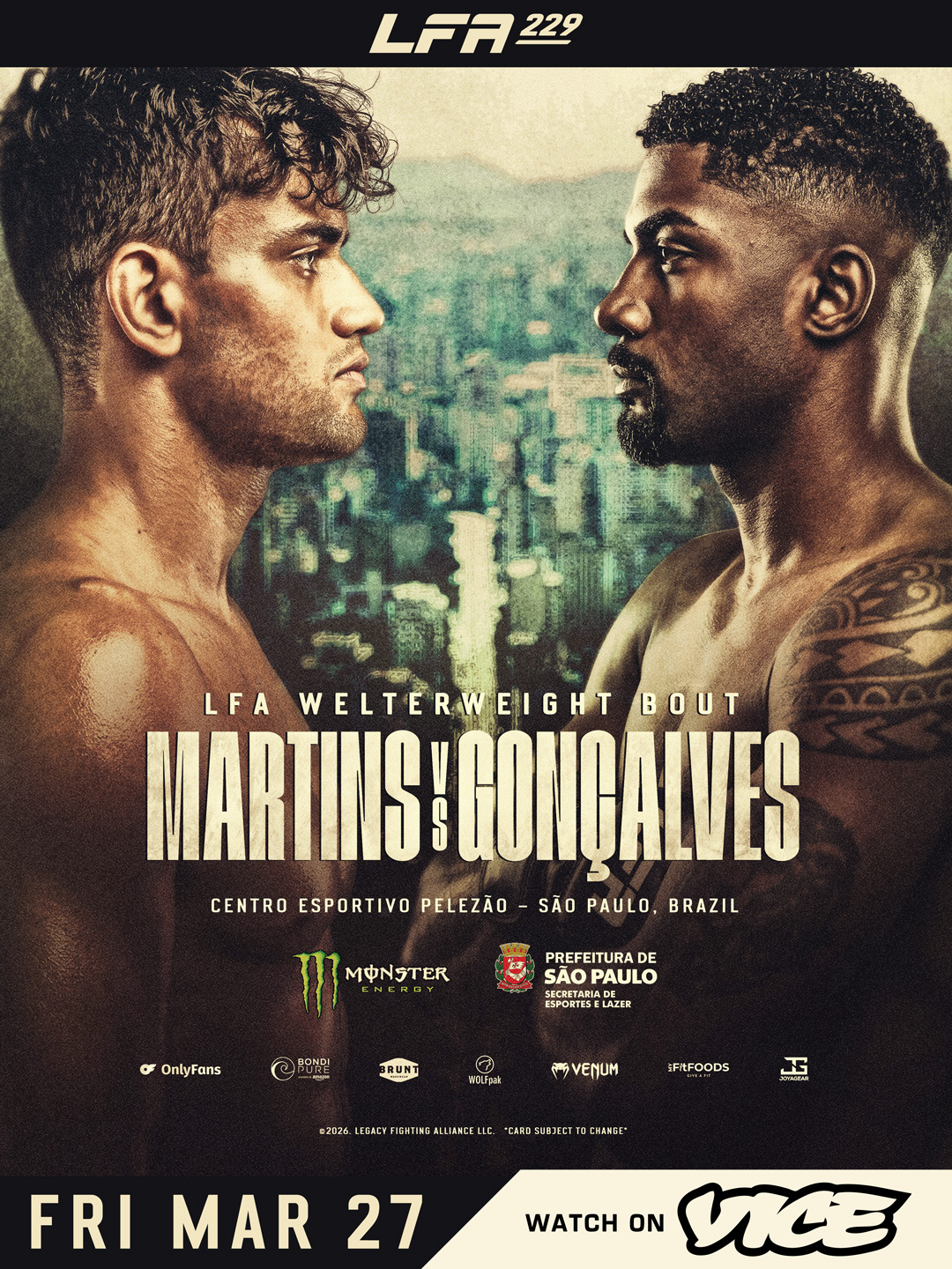 Centro Esportivo Pelezão São Paulo, São PauloLFA 229: Martins vs. Gonçalves, presented by MONSTER ENERGY, will feature a welterweight main event between LFA star and The Ultimate Fighter Season 31 veteran Richard Martins (10-1) and dangerous Muay Thai specialist Vanderlei “Soul Glo” Gonçalves (9-2). The event will be broadcast live in…