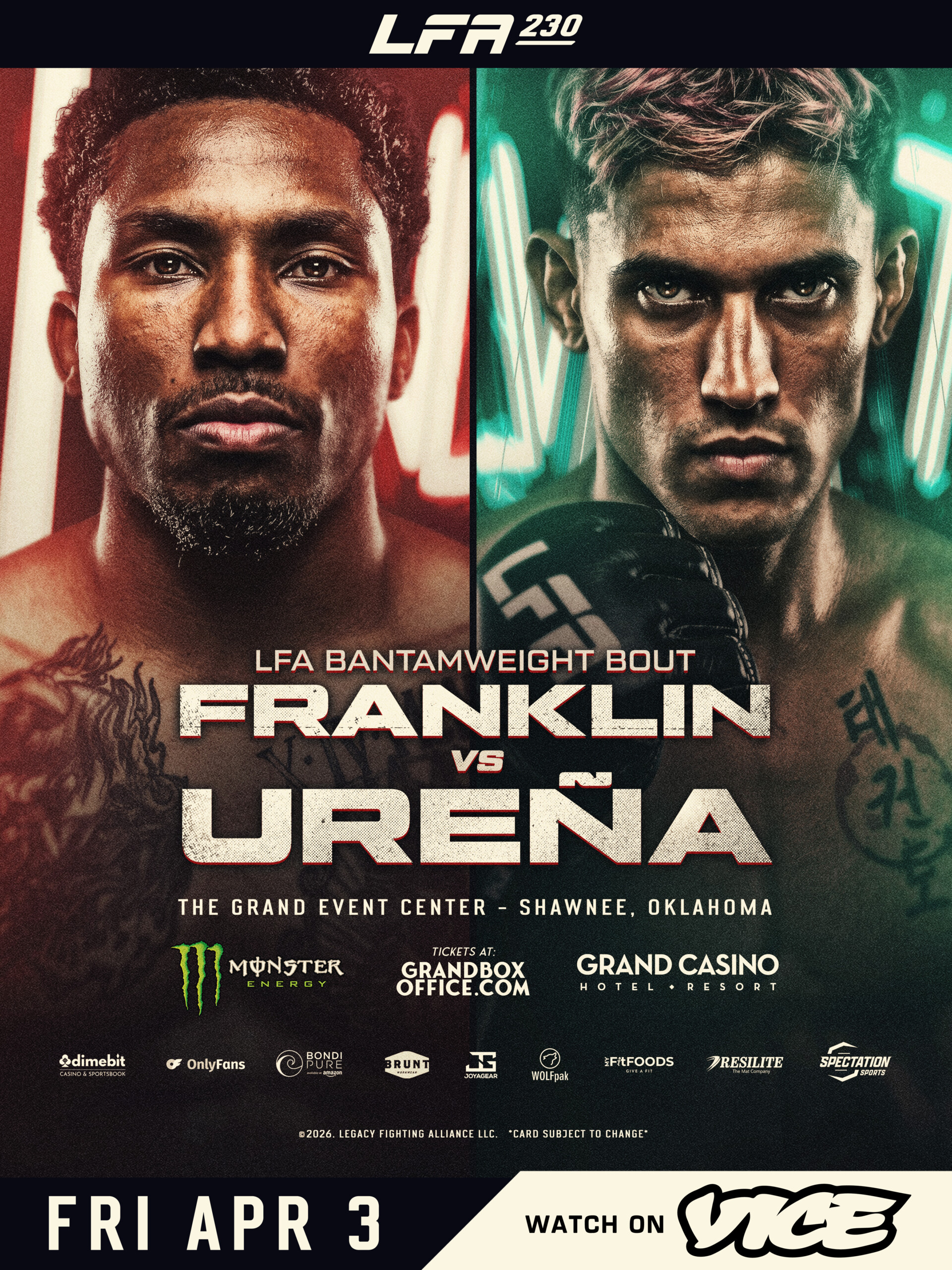 Grand Casino Hotel and Resort Shawnee, OKLFA 230: Franklin vs. Ureña, presented by Monster Energy, will be headlined by a pivotal bantamweight main event between Dominican Republic standout Micaias “The Pink Ranger” Ureña (11-3) and American contender Xavier Franklin (6-1-1). Doors will open at 5:00 p.m., with the preliminary card beginning…